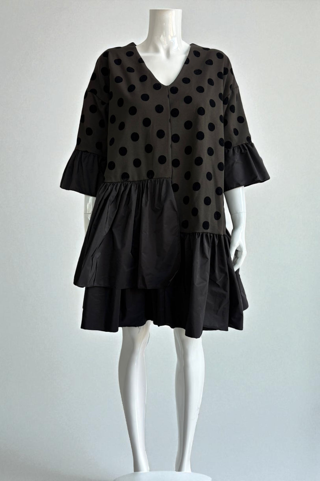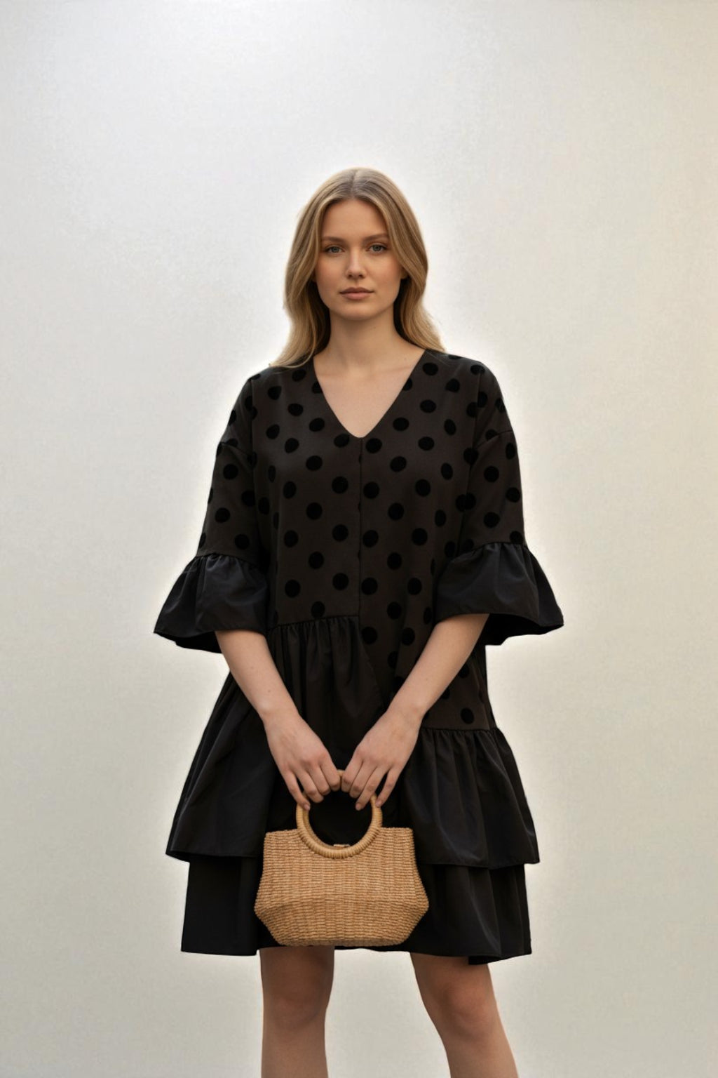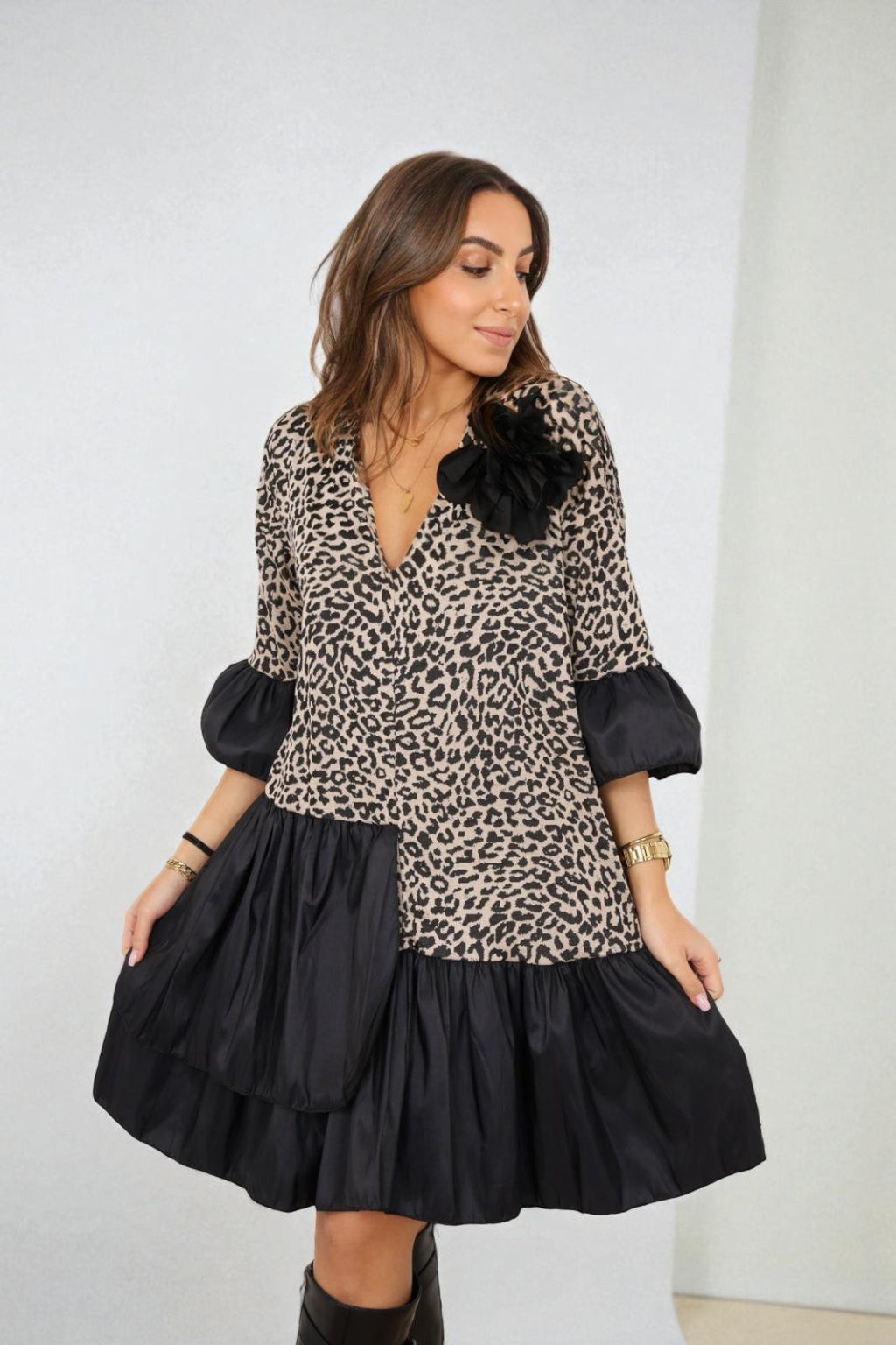 Get an Italian party dress from Milan Clothing, featuring bold pattern combinations such as leopard, tweed, and polka dots, giving it a modern look. The V-neck softly frames the face, while the flared ruffle cuffs add a playful, feminine touch to the sleeves. The hem flows with a gentle swing as you move, giving it a light, graceful drape.