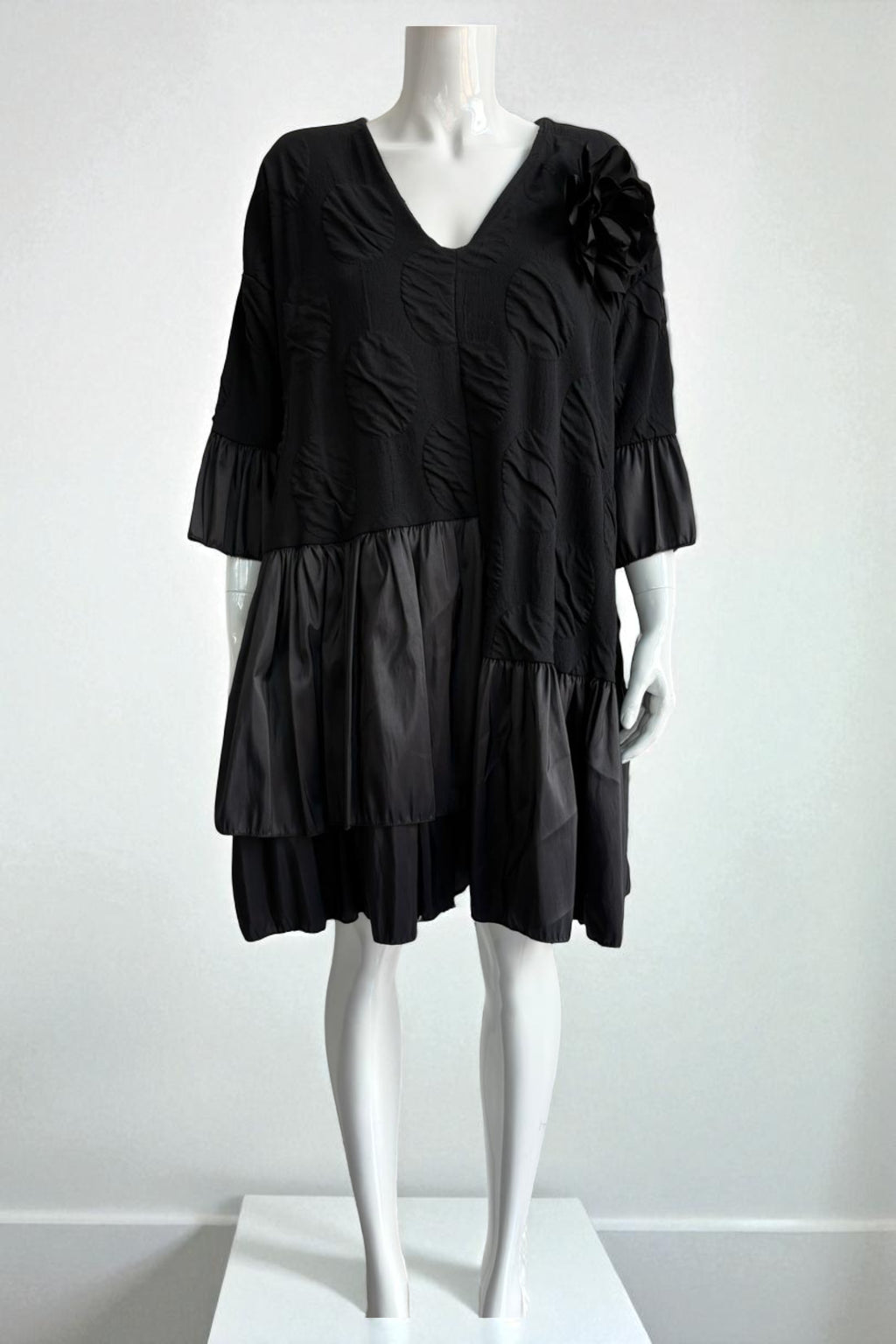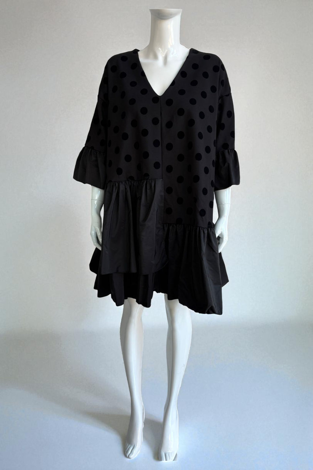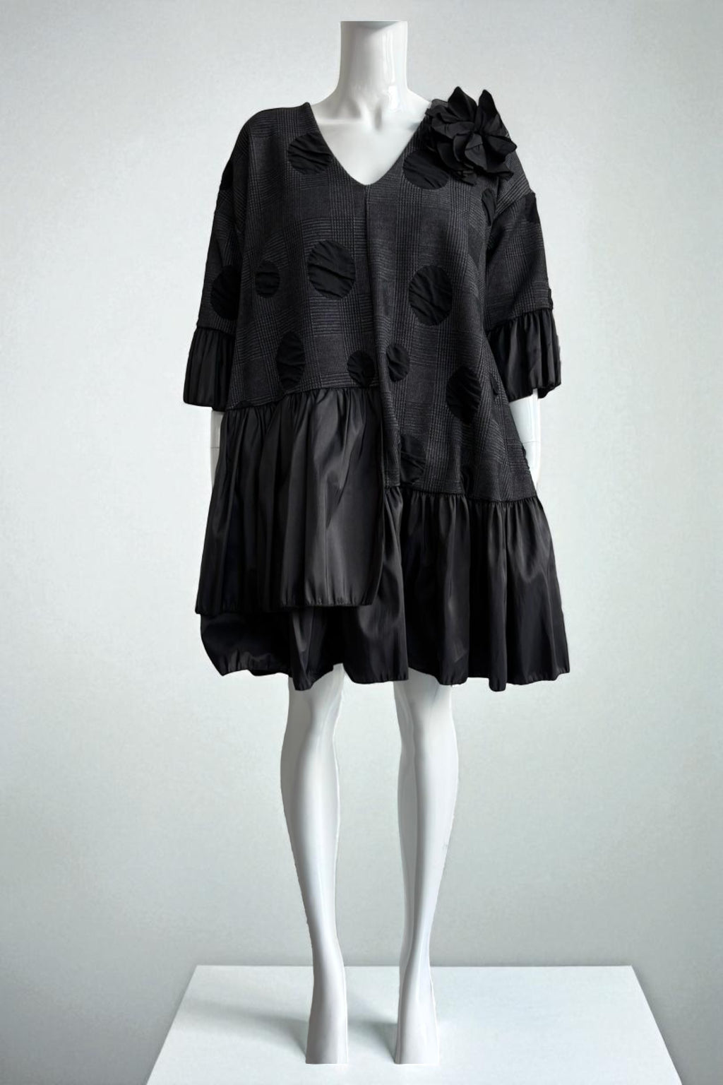 Get an Italian party dress from Milan Clothing, featuring bold pattern combinations such as leopard, tweed, and polka dots, giving it a modern look. The V-neck softly frames the face, while the flared ruffle cuffs add a playful, feminine touch to the sleeves. The hem flows with a gentle swing as you move, giving it a light, graceful drape.