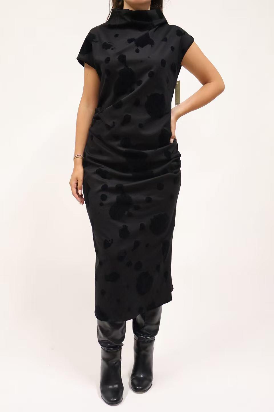 Elevate your store’s collections with our Statement Abstract Print Midi Dress - High Neck, a bold yet elegant piece perfect for evening wear and special occasions. Crafted in soft stretch fabric with a subtle sheen, this dress features an all-over flocked velvet-textured abstract print that gives it a unique, artistic edge. The draped high neckline and cap sleeves add modern sophistication, while the slim fit gently drapes for a flattering silhouette.